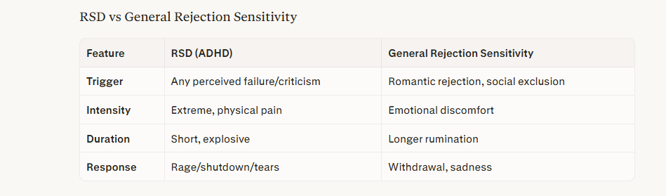 Unlike typical rejection sensitivity, RSD is ADHD‑specific and tied to emotional dysregulation.